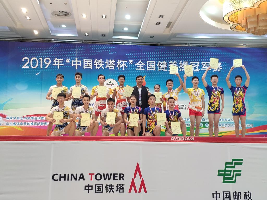 本网讯(体育学院 王艺兰)2019年全国健美操冠军赛日前在山东泰安落下帷幕。我院2019级专业硕士郭晓天同学在比赛中表现优异,荣获全国健美操冠军赛五人操第三名,经国家体育总局审批获得“国家健将级运动员”称号,这是我院培养、输出的第一位“国家健将”级健美操运动员。